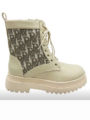 Modni škornji do kolen, narejeni iz imitacije usnja, gladka in prešita, mat tekstura. Notranjost je rahlo podložena, pol-okrogel vrh. Zapiranje z zadrgo na notranji strani ter nizko peto.